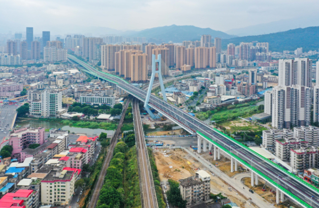 龍巖大道高架橋2013年9月開工建設(shè),2020年10月建成通車。該項目地面道路長3395米,寬78米;高架橋部分長2329米,標(biāo)準(zhǔn)段寬26米,含一座(190+150)米的獨塔雙索面斜拉橋,斜拉橋?qū)?4.2米;葫蘆溪分洪工程長667米,標(biāo)準(zhǔn)段結(jié)構(gòu)7.5×3.9米,總投資24億元。